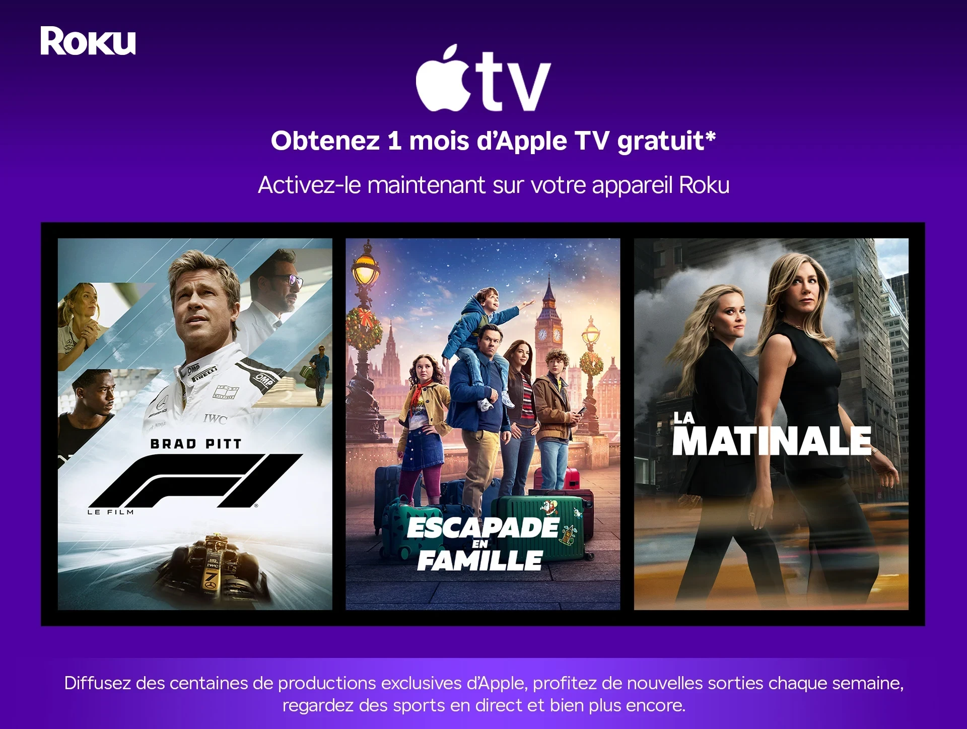 *L’offre se termine le 19 janvier 2026. Offerte sur l’app Apple TV sur les appareils de diffusion en continu Roku. L’abonnement à Apple TV ne comprend pas de service d’abonnement tiers, d’abonnement à la MLS Season Pass ou de contenu offert en location ou à l’achat dans l’app Apple TV. Nouveaux abonnements et réabonnements admissibles seulement. L’abonnement se renouvelle automatiquement, jusqu’à l’annulation. Les Modalités s’appliquent.