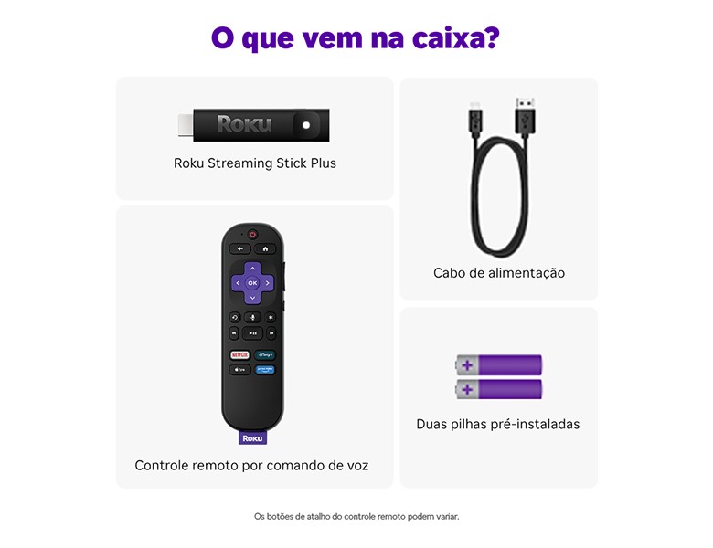 Claro. Use o Controle remoto por comando de voz incluído para ligar sua TV, ajustar o volume e controlar seu dispositivo de streaming. É isso mesmo, ele controla tanto a TV quanto o dispositivo Roku. Usando a voz, você também pode pesquisar apps, transmitir seu conteúdo favorito e muito mais. O Roku Streaming Stick também vem com duas pilhas AAA, ou seja, a caixa vem com tudo de que você precisa.